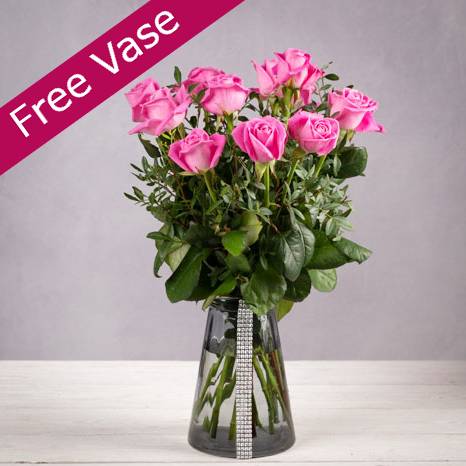 12 long stemmed roses delivered in water with a free large diamonte glass vase worth £15 and nestled in a cloud of lush greenery