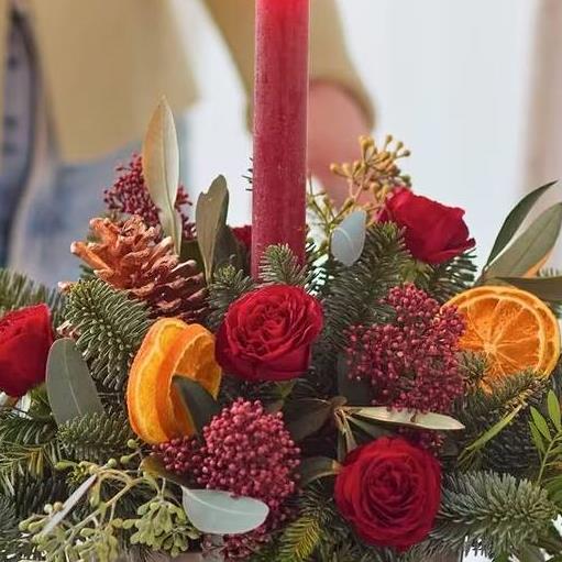 Colour & style: festive favourites. Rich reds, burgundies and greens. Pops of cream and peach. You might see coppery painted pinecones, scented dried fruit, spruce and pine.