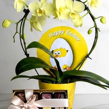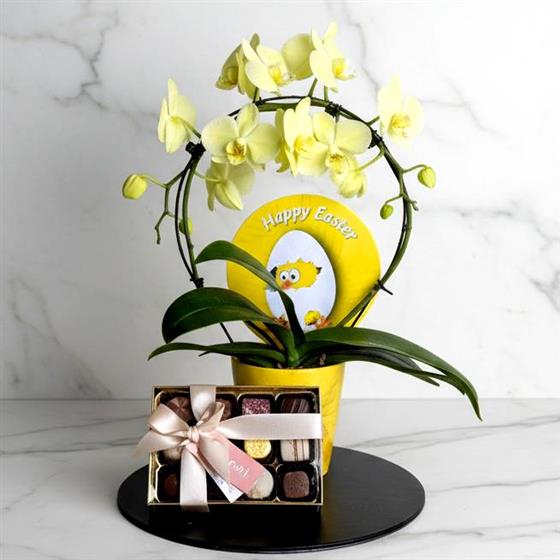 This special 45cm Hooped Fresjh Orchid is a blaze of easter yellow and is trained around a circular cane. And for that easter treat a box of Van Roy Premium Belgian Chocolates.