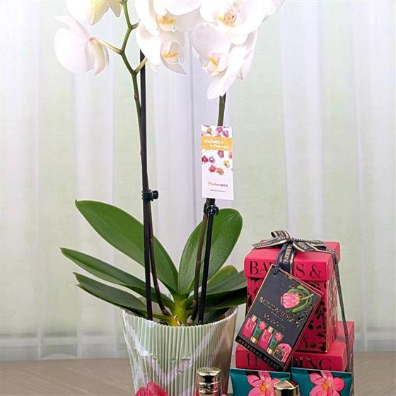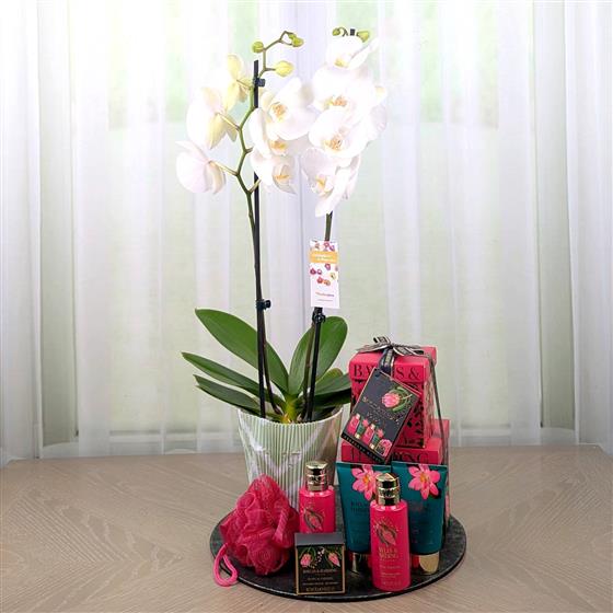 A long lasting Phalanopsis Fresh Orchid delivered with a selection of pamper products including a 100ml crème body wash,100ml bath & shower crème, 50ml body lotion, 50ml hand & nail cream 25g bath soak crystals and a body polisher. in luxurious pacaging.