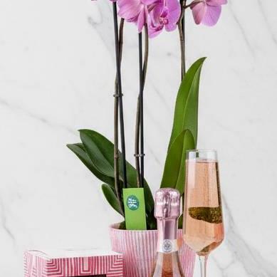 This Beautiful gift, a lovely 55cm long lasting Orchid, a 20cl bottle of La Gioiosa Rose Prosecco and a box of coco dusted truffles.
