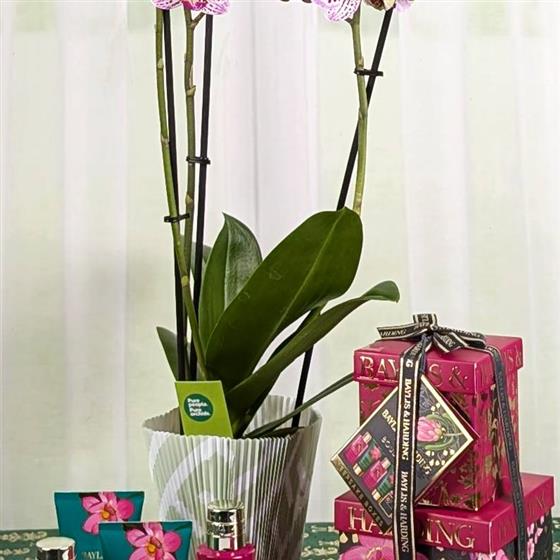 A beautiful long lasting 50cm fresh Orchid delivered with a soothing Pamper Set including a 100ml crème body wash,100ml bath & shower crème, 50ml body lotion, 50ml hand & nail cream 25g bath soak crystals and a body polisher. in luxurious pacaging.