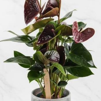 Anthurium ‘Black Love’ is a dramatic and luxurious flowering 55cm Anthurium variety prized for its deep, velvety, almost black spathes and lush, glossy foliage. This stunning plant arrives in a beautiful 18cm ceramic pot.