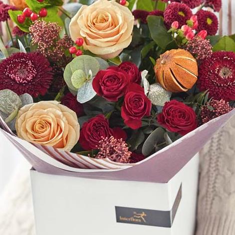 A step up from our smallest sized bouquet made by a vandella florist, this bouquet will feature more flowers or more luxurious kinds it'll feature blooms in rich red and green shades, with peach and cream highlights and pops of burgundy and cerise.