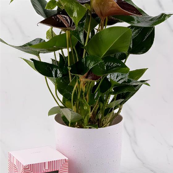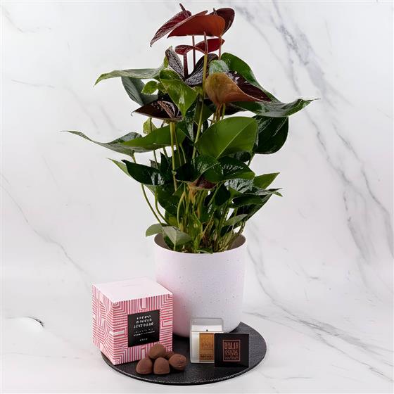 Anthurium ‘Black Love’ is a dramatic and luxurious flowering 55cm Anthurium in a pot this variety is prized for its deep, velvety, almost black spathes and lush,glossy foliage. This stunning plant arrives with a eco friendly BamBoo candle & a box of CoCo Dusted chocolates