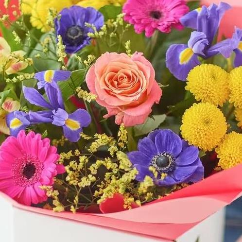 A quick rundown: a vibrant spring bouquet made and delivered by a Vandella florist.