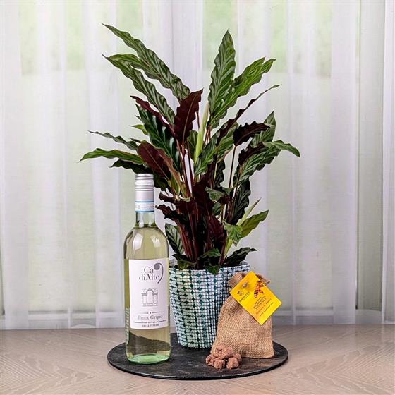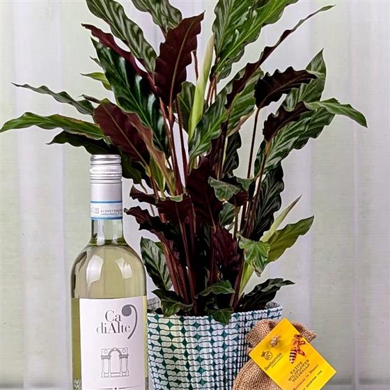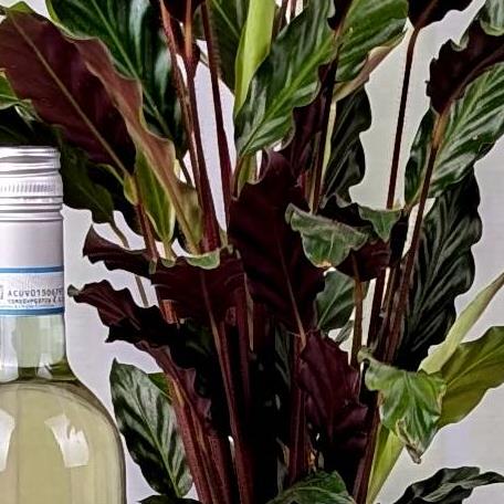 A beautiful 50cm Calathea house plant with a 750ml bottle of white wine.