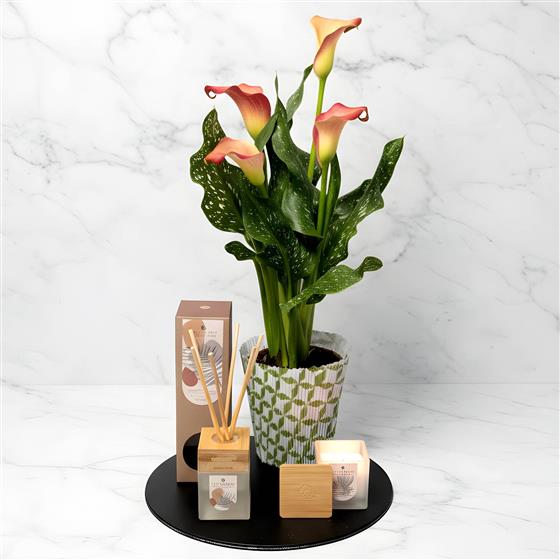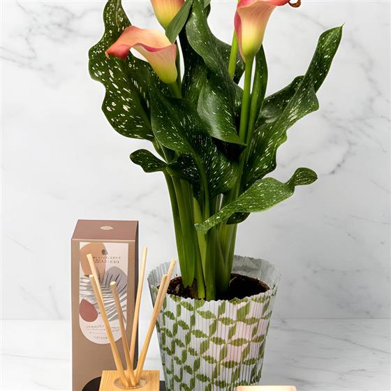 The Calla Lily is a striking houseplant known for its elegant, trumpet-shaped blooms and glossy green leaves. It is delivered with a Restore Reed Diffuser & a Restore Candle.
