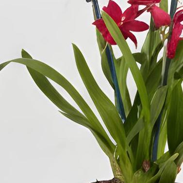 A beautiful, easy to care for Orchid in a striking red tone with a little mustard lip to each bloom presented in a ceramic pot.