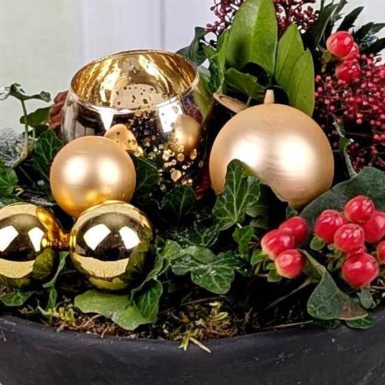A lovely Fresh ceramic bowl containing moss, ivy, berries, pine cones, Gold Baubles and a Gold Glass Candle Holder.