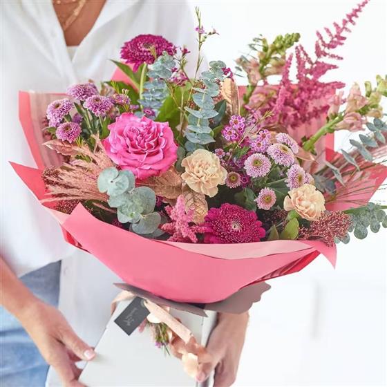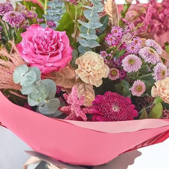 One of our bigger Christmas bouquets made by a Vandella florist, this one is inspired by the latest trends and styles in design and floristry. It'll feature blooms in cerise and purple tones, with soft pink, peach or lilac shades. It might also feature dried flowers or foliage painted in copper or rose gold.