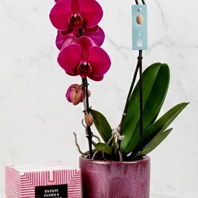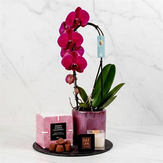 A stunning Hooped Orchid In a ceramic pot along with a long lasting BamBoo fragarant candle & a box of CoCo dusted truffles.