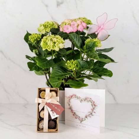 A lovely Pink Hydranger in a classic grey ceramic pot delivered with a box of carefully selected Belgian Chocolates & a full size card with your message on it