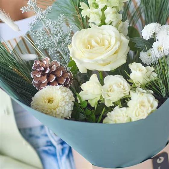 A winter woodland. Expect blooms in soft and snowy shades. Whites, creams, foresty greens. Contrasts of apricot and muted pink. You might see dried flowers too.