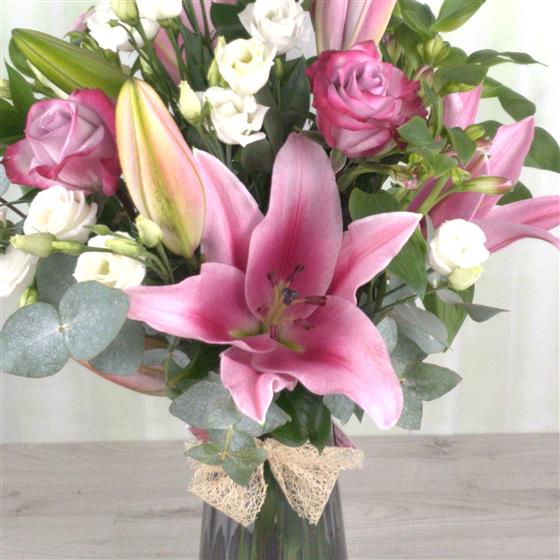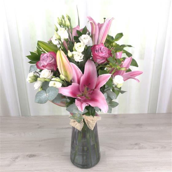 This beautifull selection of flowers comes with a selection of quality flowers including oriental lily's and long stemed roses in a contemporary glass vase