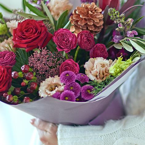 Choose a style to make it just right for them. This season gift boxes in our classic style will feature blooms in plum and burgundy colours. You might also see reds and greens with highlights of soft pink and copper.