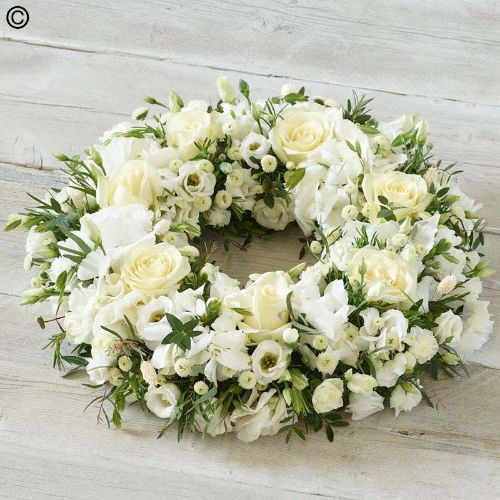 A profusion of white blooms, this elegant wreath features the finest hydrangeas, fragrant rosemary and dried lagarus bunny tails.