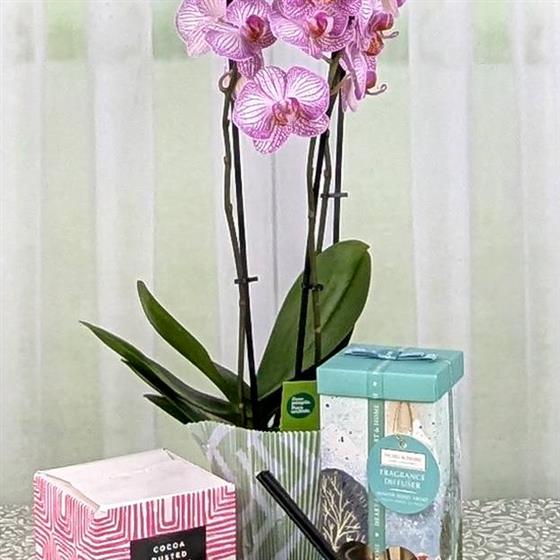 A long lasting 50cm double stemmed orchid together with a Winter Berry diffuser with up to 12 weeks of continual flame-free fragrance. Also A box of dusted truffle chocolates