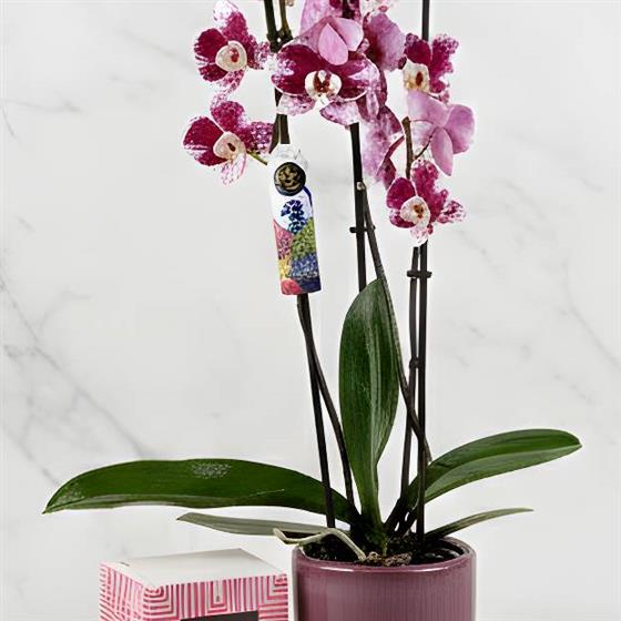 A beautiful Bonita 55cm Orchid in a plum stone pot & a box of CoCo Dusted Truffles