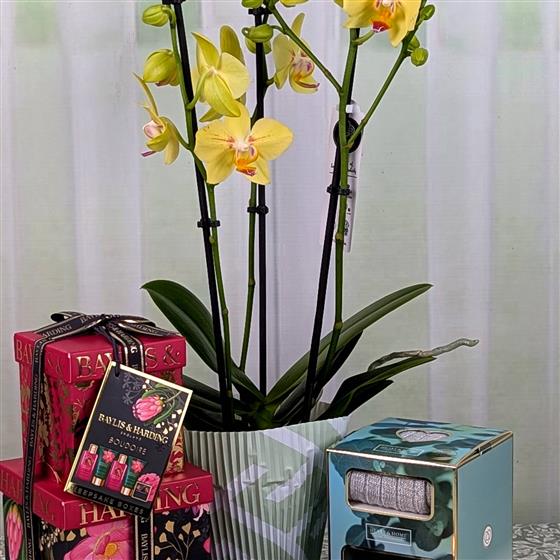A beautiful long lasting 50cm fresh Orchid delivered with a Candle and Warm Socks Set and a selection of pamper products including a 100ml crème body wash,100ml bath & shower crème, 50ml body lotion, 50ml hand & nail cream 25g bath soak crystals and a body polisher. in luxurious packaging.