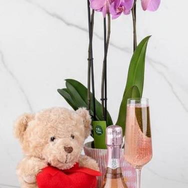 This gift set includes a lovely Orchid and a 20cl bottle of La Gioiosa Rose Prosecco delivered by a Cuddly Bear.