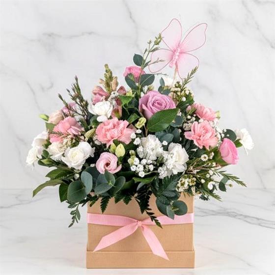 A Pretty Pastel Hat Box in soft tones with lush greenery and a pink bow.
