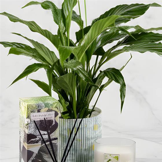 Our 50cm Peace Lilies are very popular and easy-to-grow houseplants known for their glossy, dark green leaves and distinctive white flowers. This gift set also comes an eco friendly large 2 wick candle & River Rock diffuser features white musk, lush bergamot, zesty citrus and touches of white pepper. Up to 12 weeks of continual flame-free fragrance.