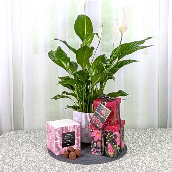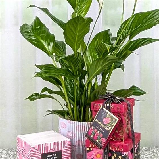 A lovely fresh 50cm Peace Lily with Cocoa Dusted Chocolates and a soothing Pamper Set including a 100ml crème body wash,100ml bath & shower crème, 50ml body lotion, 50ml hand & nail cream 25g bath soak crystals and a body polisher. in luxurious packaging.