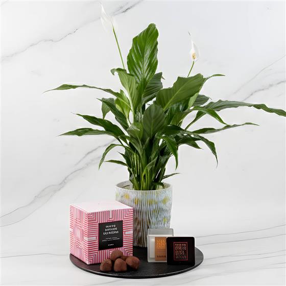 This Lovely 50cm Peace Lily together with an eco friendly Bam Boo 80g candle and a box of coco dusted truffle chocolates.