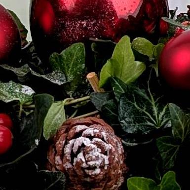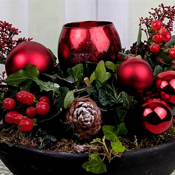 A lovely Fresh ceramic bowl containing moss, ivy, berries, pine cones, Red Baubles and a Red Glass Candle Holder.