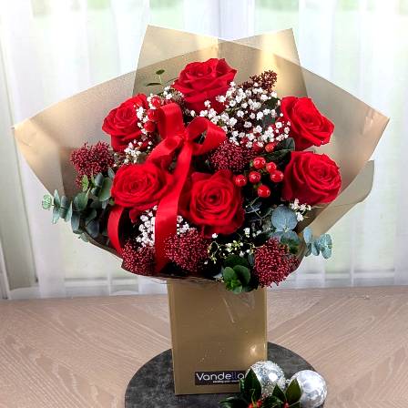 A beautiful christmas gift of six of our best of red roses surrounded by berries and foliage.