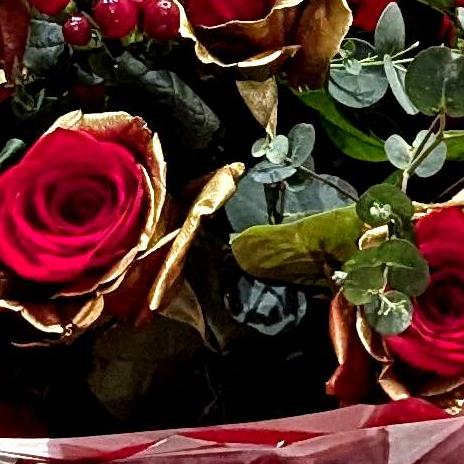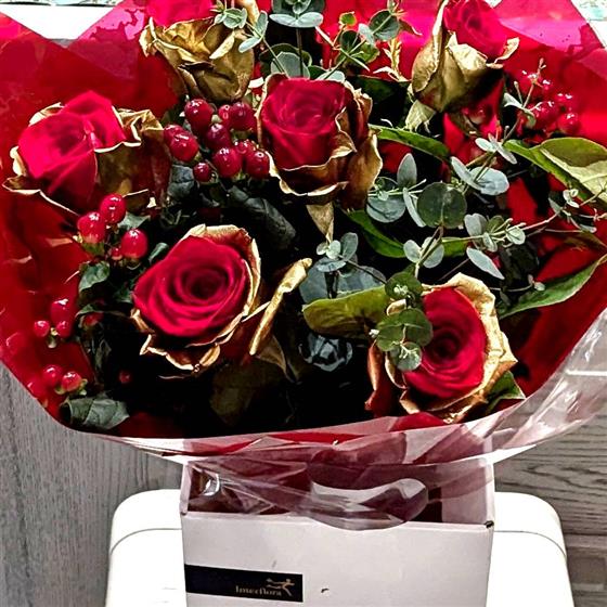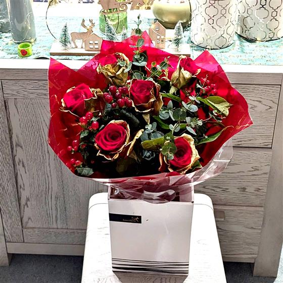 Six top quiality roses with a splash of luxury nestled in berries & greenery.