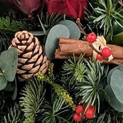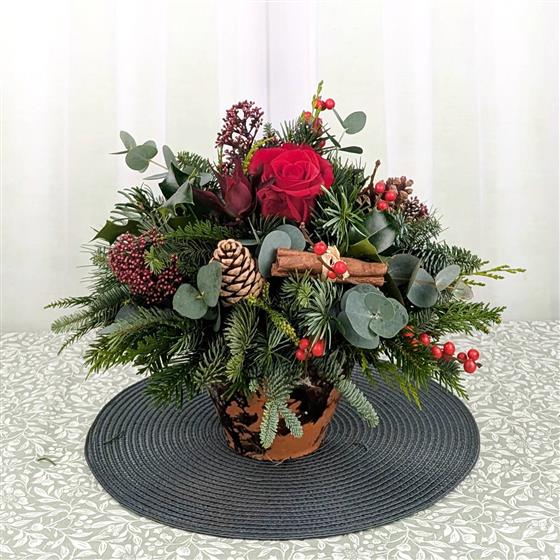 A long lasting terracotta grave arrangement featuring pine cones, cinamon stick, berries seasonal greenery and finished with a fresh red rose in the center.