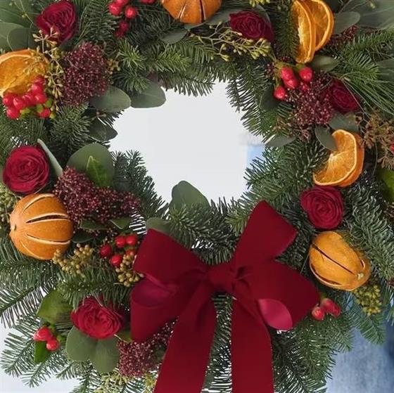 A classic Christmas wreath of fresh foliage and dried fruits, expertly arranged with care by a Vandella florist.