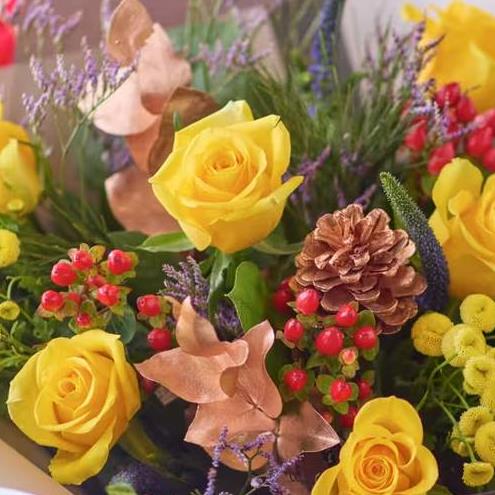 One for bringing colour and joy in the depths of winter. Colour & style: mellow yellow. A mix of fresh flowers and foliage and at least 6 yellow roses.