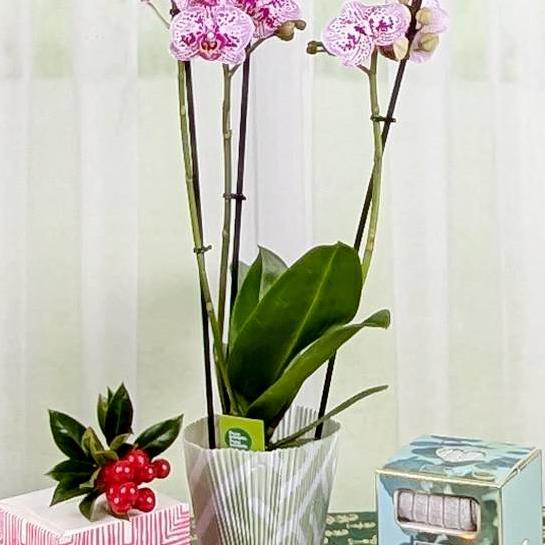 A beautiful long lasting 50cm fresh Orchid delivered with a Candle and warm socks gift set plus a box of coco dusted truffle chocolates.
