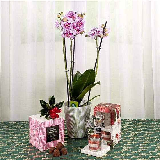 A lovely 50cm Fresah Orchid delivered with a mini candle Spinning Carosel that gently spin's in the warm glow. and a box of coco dusted truffle chocolates.