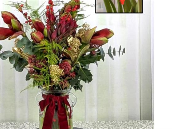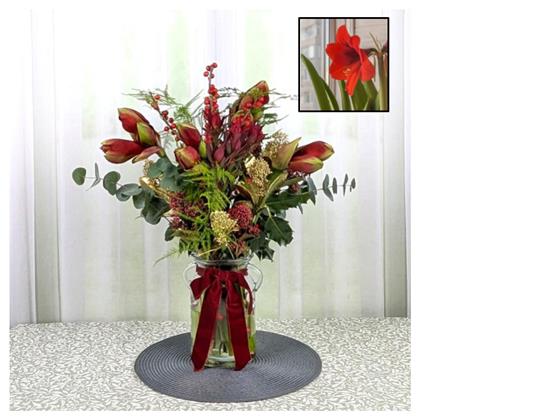 A stunning long lasting glass vase of multi bloom Red Amaryllis,Ilex berries & seasonal greenery finished off with a red velvet bow