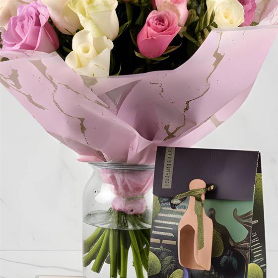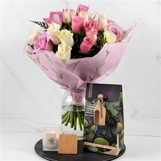 A fabulous boquuet of 20 pastel passion roses, nestled in greenery delivered with a Restore BamBoo Candle and Bukhara Bath Salts & wooden Scoop.